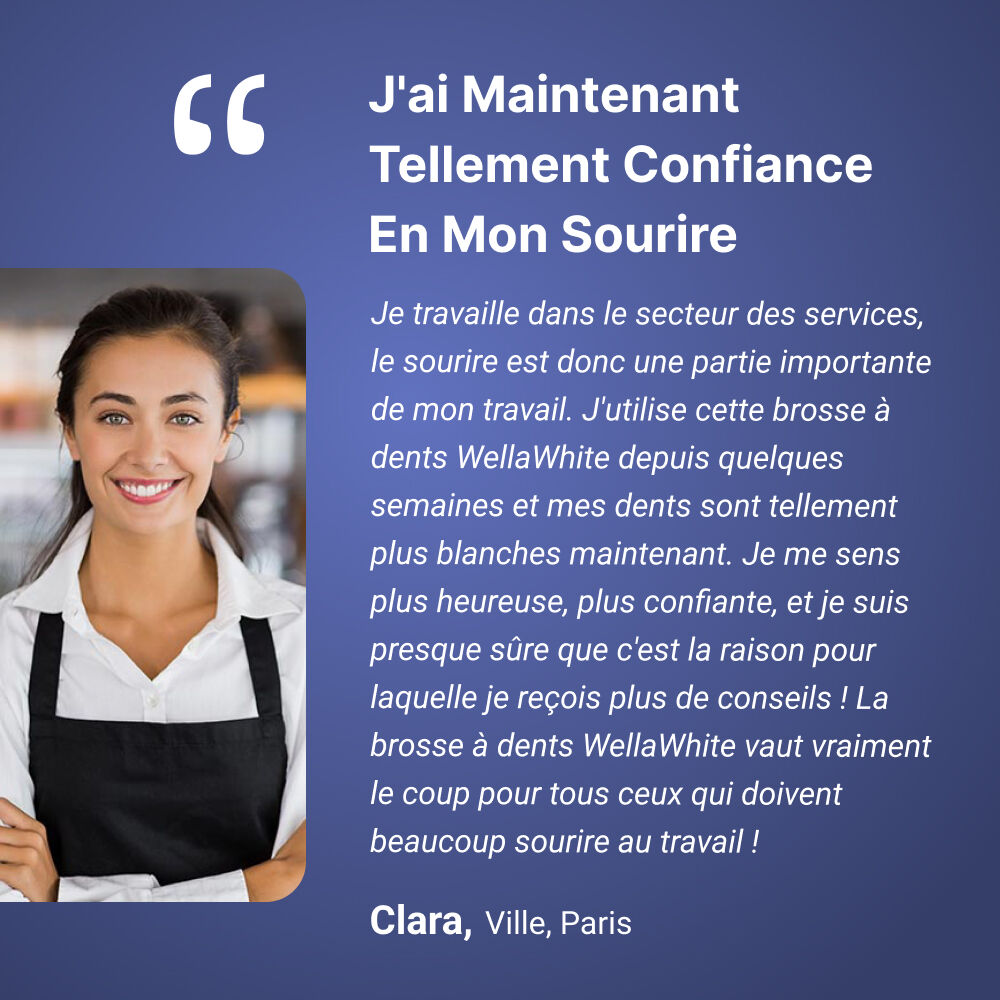 Je suis tellement contente de ma brosse à dents wella white ! Mes dents sont plus propres que jamais et j’ai remarqué une nette amélioration de leur éclat et de leur couleur ! Même mon dentiste est d’accord pour dire qu’après avoir commencé à utiliser cette brosse à dents, ma santé dentaire s’est améliorée et maintenant je n’ai plus besoin de faire des nettoyages d’hygiène professionnels aussi souvent qu’avant.
